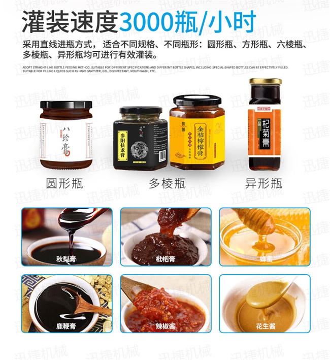 枇杷膏自動灌裝機生產(chǎn)流水線適用于各種1、各種膏滋如:秋梨膏、枇杷膏、鹿鞭膏、蜂蜜等的灌裝。2、調(diào)味醬如:香菇醬、辣椒醬、豆瓣醬、花生醬、芝麻醬、牛油火鍋底料、紅油火鍋底料。3、采用多規(guī)格的灌裝轉(zhuǎn)閥、灌裝頭,可適應(yīng)不同客戶物料的灌裝需求。