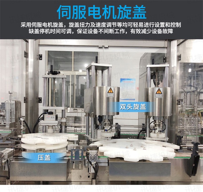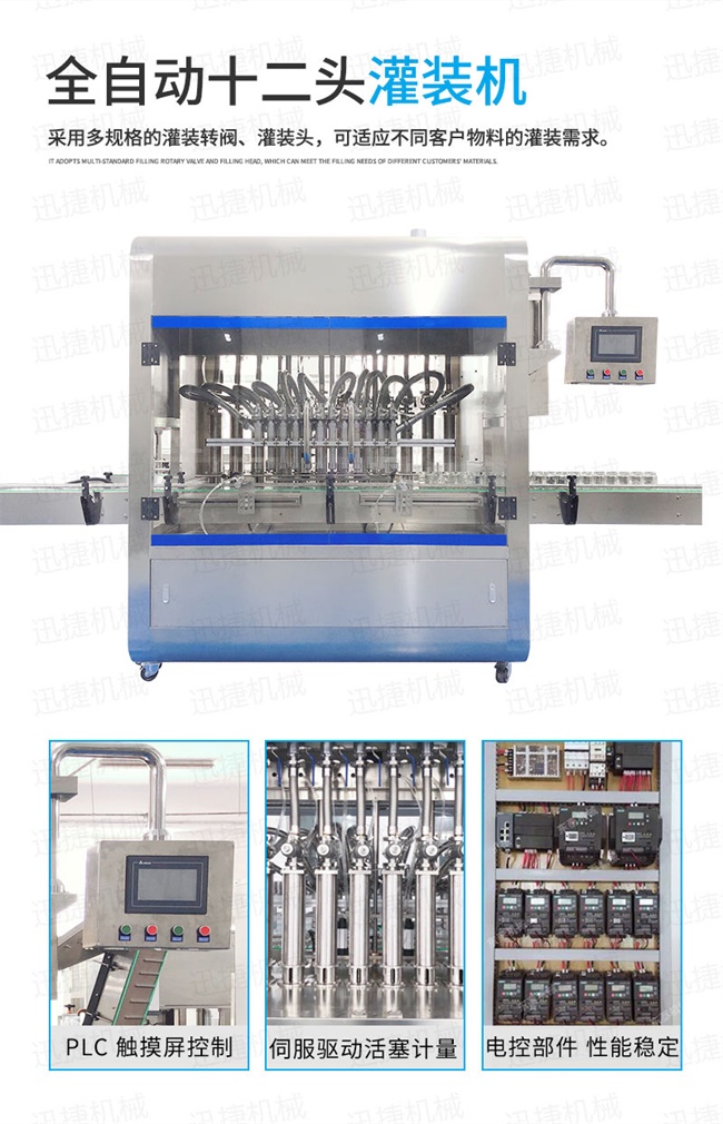 2、灌裝機以進口PLC電腦控制、伺服驅(qū)動計量,全彩色觸摸屏人機界面,一鍵完成計量切換確保容量之調(diào)整簡易、快捷、準確。是任何形式的灌裝機無法替代的;