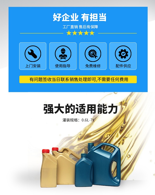 機器應用范圍:1-10升通用型號,機器采用流量計計量,觸摸屏控制,參數一鍵調整,方便快捷。可以灌裝各種油脂,油料。灌裝頭采用專用的油脂防滴漏灌裝頭,不滴漏。機器設定有快慢速技術,可以先快后慢,防止物料噴濺。保持生產車間干凈潔凈。