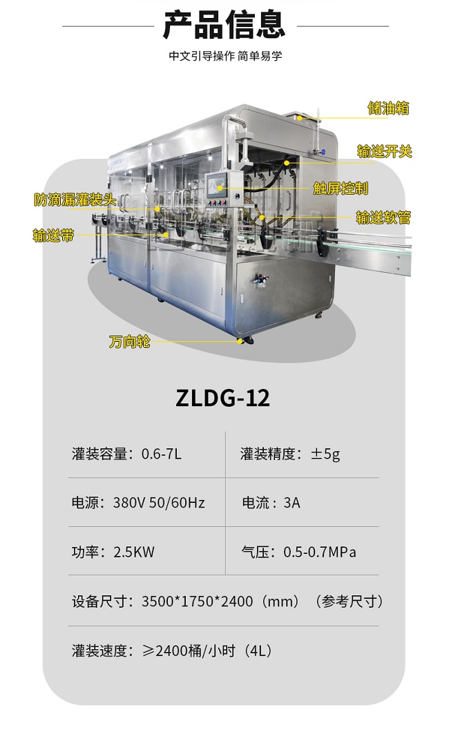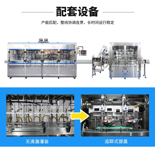 該灌裝機可以配置  高速旋蓋機  油桶貼標機  油瓶噴碼機  油壺自動自動裝箱碼垛機。組成油脂灌裝包裝流水線。高效、節能、自動化的設備。