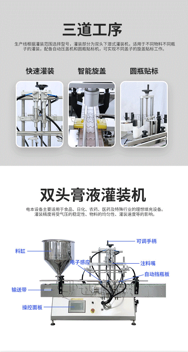 產(chǎn)品說明:生產(chǎn)線根據(jù)灌裝范圍選擇型號(hào),灌裝部分為雙頭下潛式灌裝機(jī),適用于不同物料不同瓶子的灌裝,配備自動(dòng)壓蓋機(jī)和圓瓶貼標(biāo)機(jī),可實(shí)現(xiàn)不同蓋子的旋蓋貼標(biāo)工作。