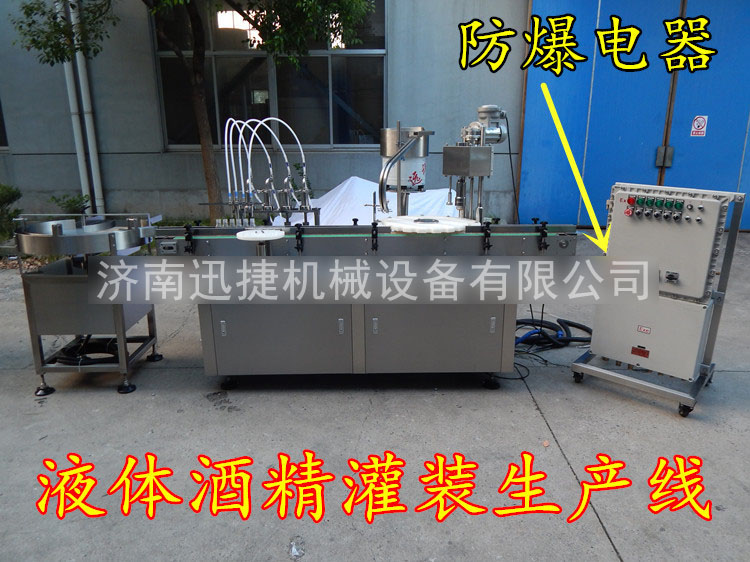 該機是一種由微電腦(PLC)可編程控制,光電傳感,氣動執行于一體的高新技術灌裝設備。全自動防爆酒精灌裝機是一款專業的酒精包裝機械,其可對各種酒精如電子酒精、無水酒精、香水酒精、食用酒精、玉米酒精等液體易燃產品。廣泛適用于酒精、化工、化妝品、日用化工用品、各種粘稠液體等的扁瓶、橢圓瓶類容器包裝,是完全符合GMP標準生產規范的較包裝設備。
