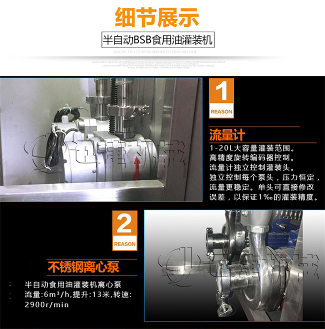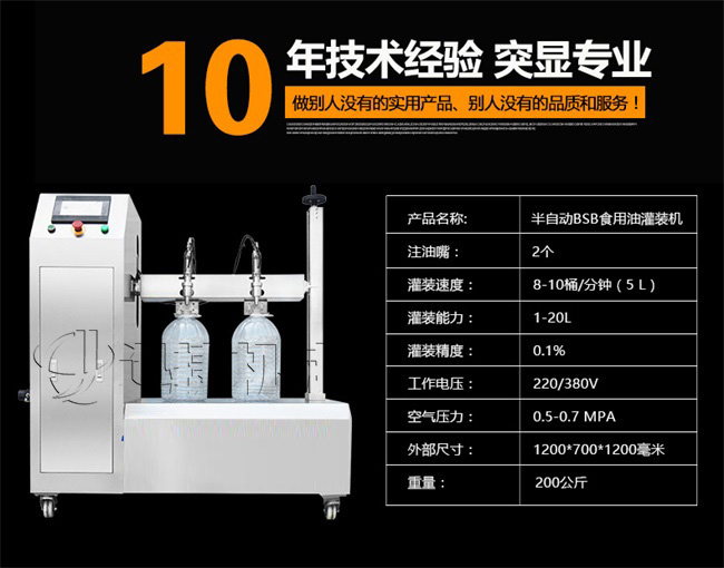 本機適用于花生油、大豆油、菜籽油、色拉油、芝麻油、石油化工潤滑油等各種油類和粘稠液體的定量要求。半自動雙頭電動BSB食用油灌裝機:采用的微電腦技術,自備動力,管路無需加壓,節(jié)約運行成本;自動檢測油浙、自動修正溫度變化引起的密度變化,適合大溫差環(huán)境的油品灌裝工作,使用方便靈活;機電一體化設計,安裝方便,整機價格低廉。