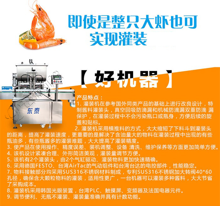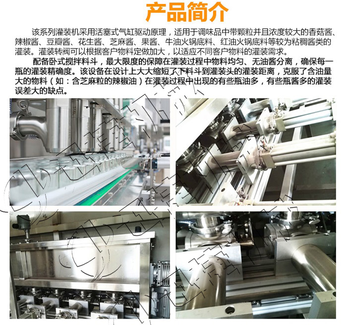該系列灌裝機采用活塞式氣缸氣動原理,適用于調味品中帶顆粒并且濃度較大的香菇醬、辣椒醬、豆瓣醬、花生醬、芝麻醬、果醬、牛油火鍋底料、紅油火鍋底料等較為粘稠醬類的灌裝。灌裝轉閥可以很具客戶物料定做加大,以適應不同客戶物料的灌裝需求。配備臥式攪拌料斗,限度的保障在灌裝過程中物料均勻、無油醬分離,確保每一瓶的灌裝精確度,該設備在設計上大大縮短了下料斗到灌裝頭的灌裝距離,克服了含油量大的油料(如:含芝麻粒的辣椒油)在灌裝過程出現的有些瓶油多,有些瓶醬多的灌裝誤差大的缺點。